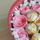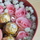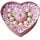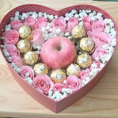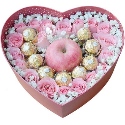 花 材19支粉玫瑰、9顆圓形巧克力,1只平安果(蘋果)依次排列成心形效果,滿天星或其他配花適量點綴