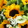 花 材向日葵6枝,綠色洋桔梗6枝,梔子葉1扎,白色相思梅5枝