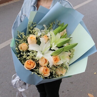 名 稱好事連連(11枝香檳玫瑰,2枝白百合)