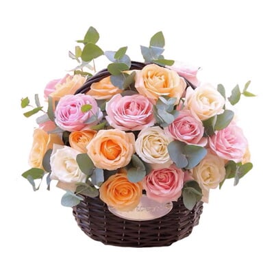 花 材33枝玫瑰手提花籃,11朵粉佳人、11朵香檳玫瑰、11朵白玫瑰,適量尤加利葉填充