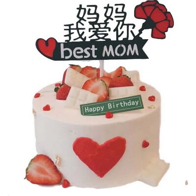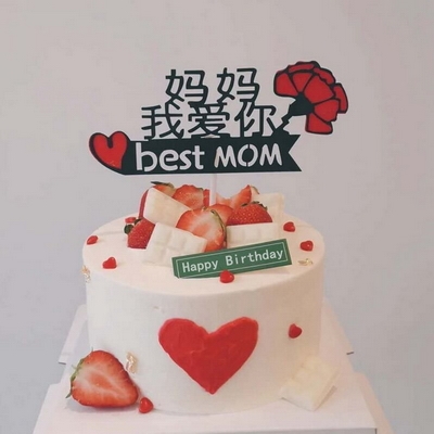 圓形水果夾心蛋糕,表面媽媽我愛你插件,時令水果,巧克力裝飾