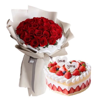 33枝紅玫瑰;心形水果蛋糕,草莓(時令水果為準(zhǔn))鋪面和底部圍邊