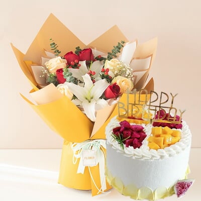 8支玫瑰,2支百合+圓形水果蛋糕