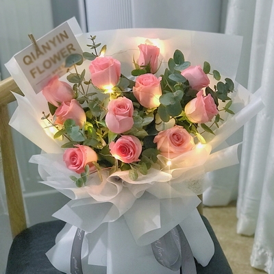 花 材11枝粉玫瑰、LED燈,尤加利葉間插