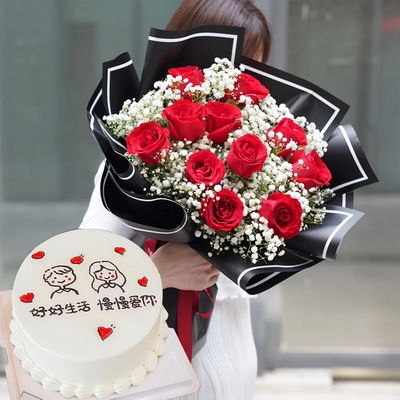 11枝紅玫瑰,白色滿(mǎn)天星搭配;圓形鮮奶蛋糕