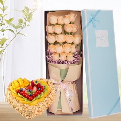 19枝香檳玫瑰+心形水果蛋糕