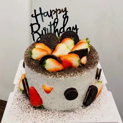 圓形巧克力蛋糕,表面可可粉,水果,奧利奧精美裝飾