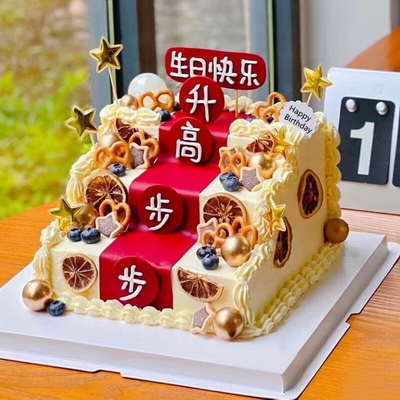 四層階梯款蛋糕。內(nèi)層新鮮蛋糕胚,新鮮水果夾心,表層干檸檬片,餅干,祝福語(yǔ)貼片等裝飾