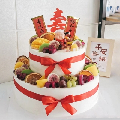 12寸+8寸雙層祝壽蛋糕。內(nèi)層蛋糕胚+新鮮奶油疊加,新鮮果肉夾層,表層壽星婆,無(wú)花果干,時(shí)令水果等裝飾