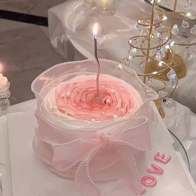 現(xiàn)烤蛋糕胚,中層新鮮奶油+應(yīng)季水果夾心,表層奶油裱花,煙花蠟燭裝飾,側(cè)邊圍褶皺紗