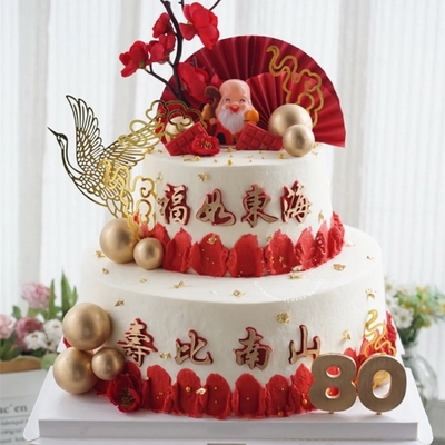8寸+12寸雙層蛋糕。新鮮蛋糕胚,中層新鮮水果夾心,表層壽星公,松鶴,折扇等裝飾