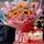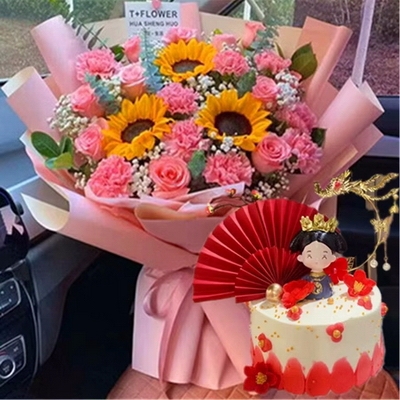 10支粉康,9支粉玫瑰,3支向日葵,白色滿天星間插,尤加利葉、梔子葉搭配;圓形水果蛋糕,現(xiàn)烤蛋糕胚,新鮮水果夾心,優(yōu)質(zhì)奶油疊加,表層中國風(fēng)主題配件裝飾