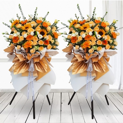 花 材香檳玫瑰+扶郎花+向日葵開(kāi)業(yè)花籃一對(duì),洋桔梗、尤加利葉搭配