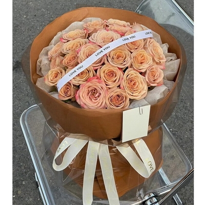包 裝米黃色雪梨紙內(nèi)襯,棕色霧面紙圓形包裝,玻璃紙外圍,字母緞帶花結(jié)束扎
