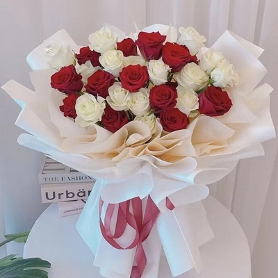 花 材12支紅玫瑰,16支白玫瑰混搭花束