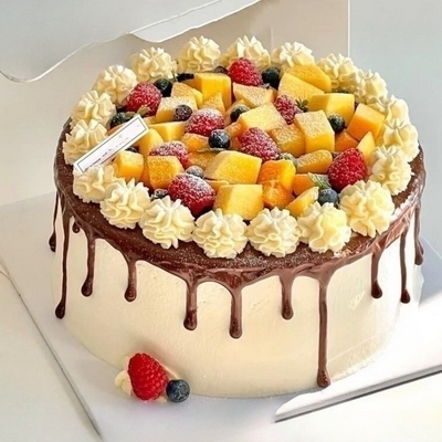 內(nèi)層蛋糕胚+優(yōu)質(zhì)奶油疊加,水果果肉夾層,表層奶油裱花,芒果,藍莓,草莓等裝飾,側(cè)邊巧克力醬淋面
