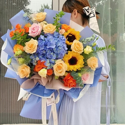 花 材7支香檳玫瑰,2支粉玫瑰,2支向日葵,1支藍(lán)色繡球,橙色泡泡、洋桔梗、噴泉草等搭配