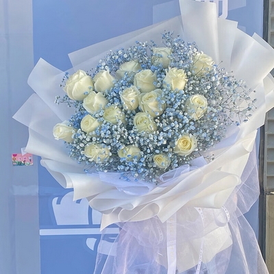花 材19枝白玫瑰,藍色滿天星