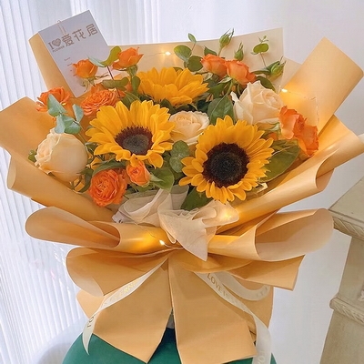 花 材3枝向日葵,3支香檳玫瑰,彩燈一條,橙色泡泡,尤加利