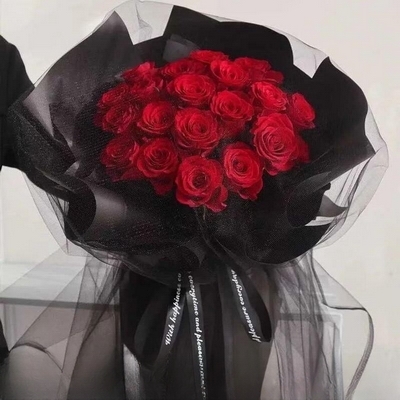 包 裝黑色霧面紙多角韓式包裝,黑紗蒙面花束,精美絲帶