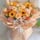 花 材11枝香檳玫瑰,4枝向日葵,粉色桔梗,橙色泡泡,雛菊,尤加利