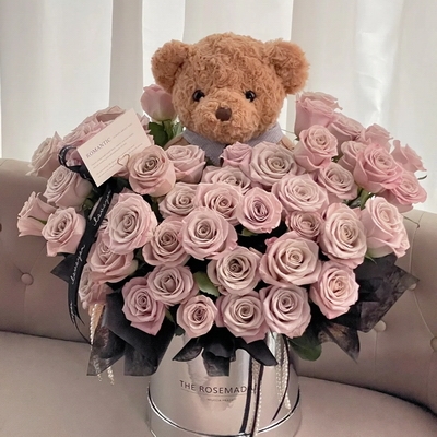 花 材52枝曼塔玫瑰,1個30cm左右高泰迪熊公仔