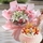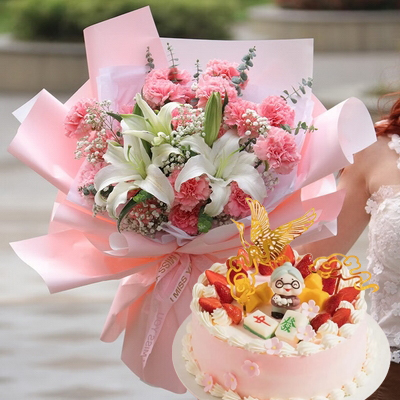 內(nèi)層蛋糕胚+優(yōu)質(zhì)奶油疊加,水果果肉夾層,表層1個壽星婆,松鶴,時令水果,麻將子等裝飾;9支玫瑰(粉+香檳),3支向日葵,5支粉邊康乃馨,洋甘菊、泡泡、尤加利葉等搭配