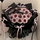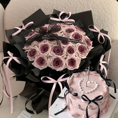 圓形鮮奶蛋糕,新鮮水果夾心,表層煙花蠟燭,蝴蝶結(jié),奶油裱花裝飾;21支烏梅子醬玫瑰,粉色+黑色蝴蝶結(jié)點綴