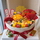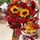 圓形無糖蛋糕,木糖醇胚子,新鮮水果夾心,表層時令水果,折扇,對聯(lián)等插件裝飾;12支紅康,7支紅玫瑰,2支向日葵,紅色翠菊,尤加利葉搭配