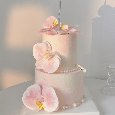 雙層加高蛋糕胚,新鮮水果夾層,粉色蝴蝶蘭,珍珠糖、煙花蠟燭等搭配